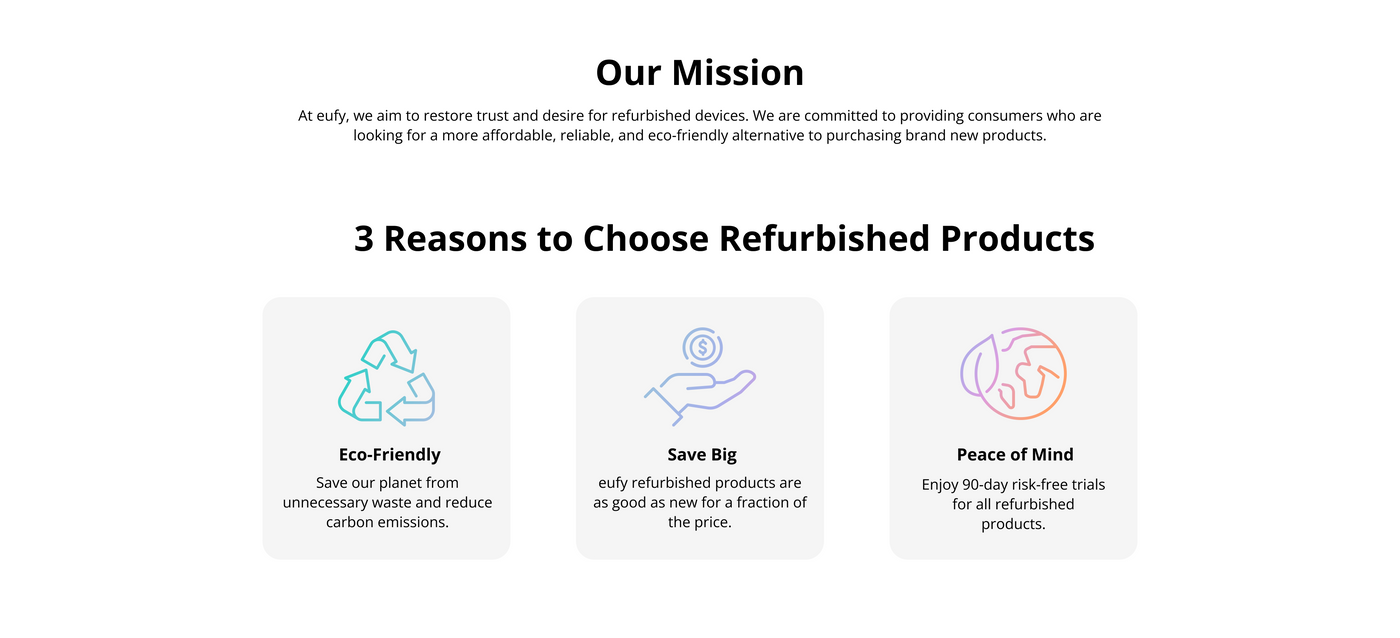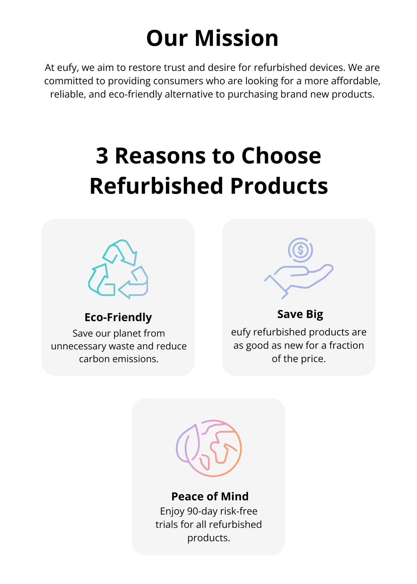 我們希望您購物愉快。如果您對產品不滿意,您可以申請更換(或憑續保收據在 90 天內退款)。如果您的翻新產品出現問題,您將享受與其他人相同的服務和支援。請透過 support@eufy.com 聯絡我們